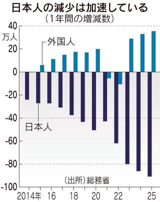 90万8574人減った。16年連続のマイナスで、前年比の減少幅は調査を始めた1968年以来、最大となった。 日本人