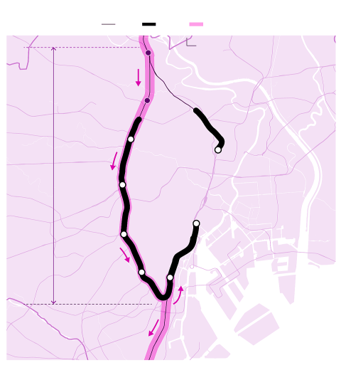 崖下にあたる低地を走る。台地上は目黒川や神田川などが谷を刻んで起伏が多いため、盛り土や切り通し